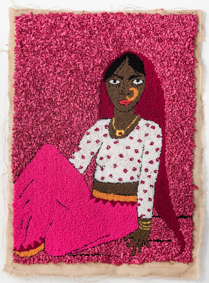 Talia Ramkilawan deals with issues of identity, culture and trauma in her work. Her bright woollen tapestry, Untitled VII (featured above), portrays a woman who we identify as Indian because of her skin tone, dress and ornate jewellery. Ramkilawan’s tapestries celebrate the complexity of South African Indian identity by subverting the stereotypical images associated with ‘Indianness’.