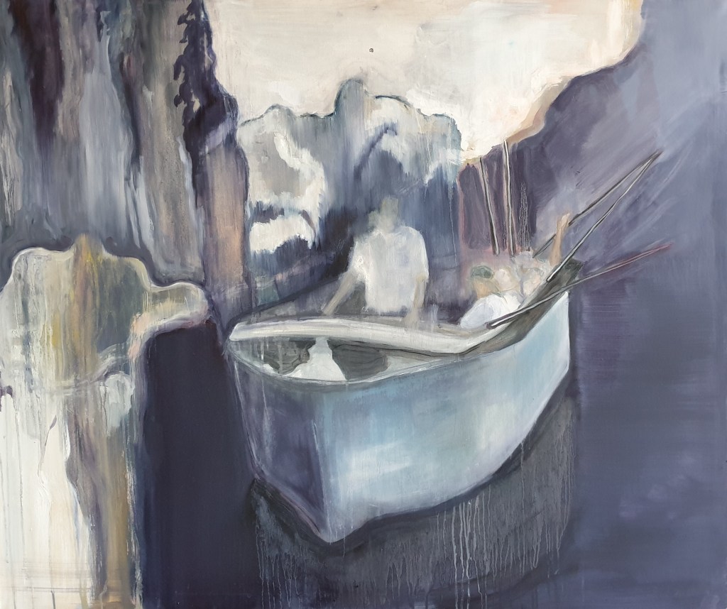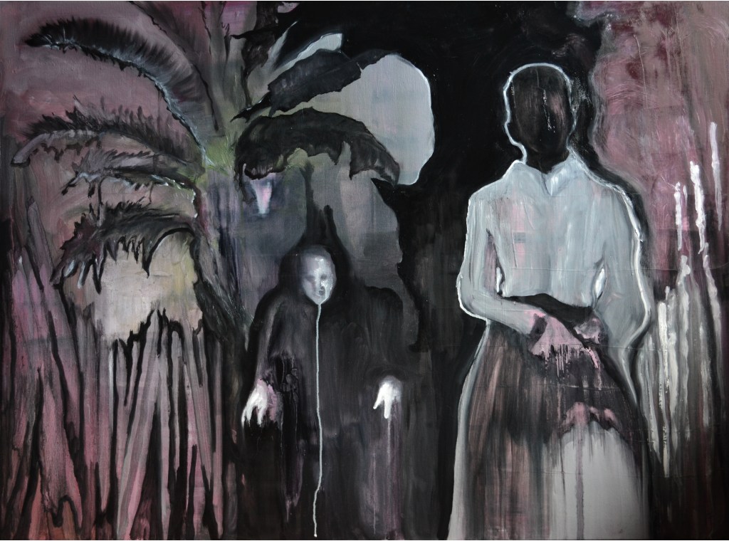 Consider the two paintings, Untitled (above) and Passage (below) which feature people within the landscape and allude to Pillay’s beliefs about memory, land, colonialism and migration. As she explains;