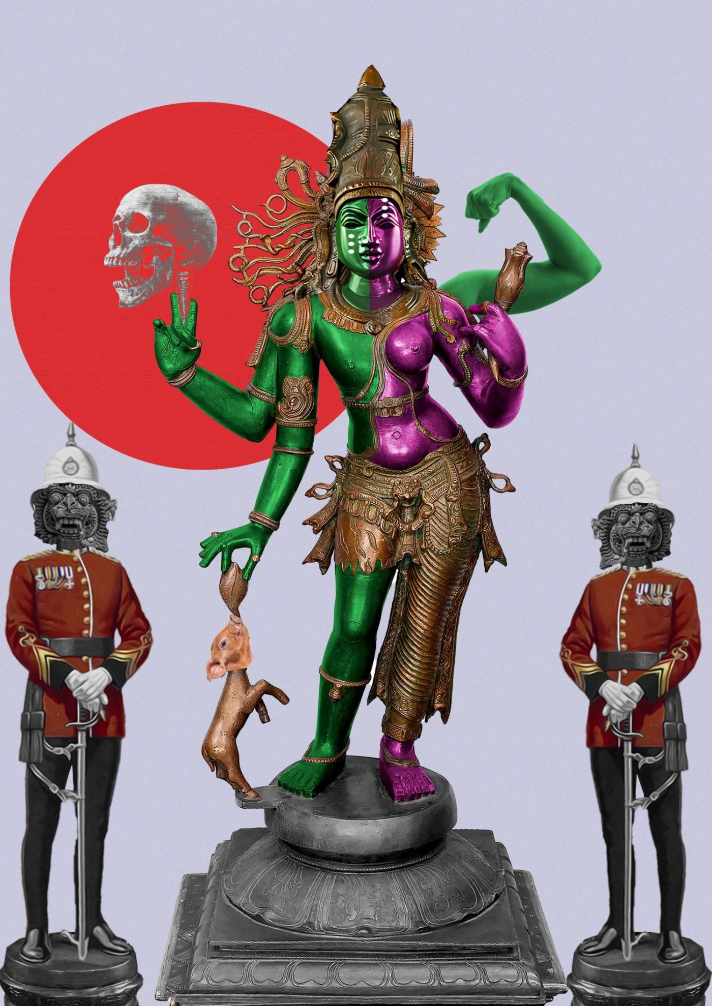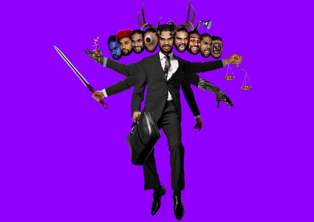 In the work, Honorable Ravan, Thumbiran references the evil, many headed monster that Hindus identify from the story of the Ramayana. Using multiple images of his own face, he has depicted Ravan as a politician, wielding a briefcase and sword.