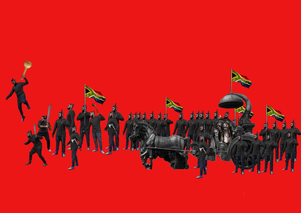In the above image, Not even a Needles width of Land, Thumbiran questions the role of South African Indians in the debate about land. He believes that as a group they are caught between the oppressed and the oppressor depending on their class and status. The image shows an army – Thumbiran in various guises- equipped with ancient Indian weapons and chariots and flying the South African flag. The opposing group is the apartheid regime of South Africa, flying the old flag.