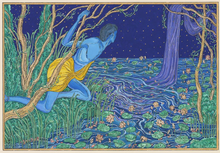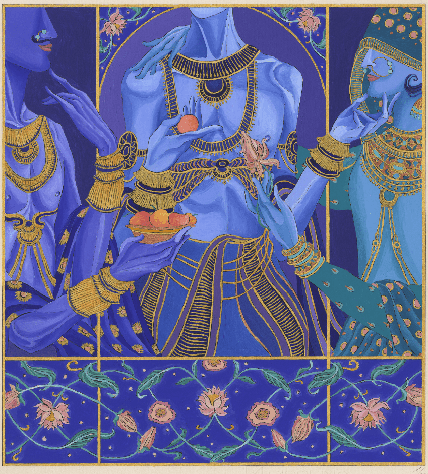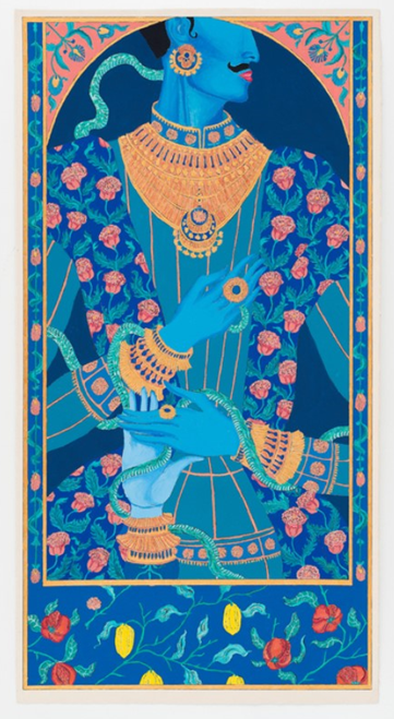 Solanki has always held “a very deep fascination for the visual culture of Hinduism; its vibrant colours, intricate patterns, and rich fabrics”. Despite the conservative and traditional values espoused by Hinduism, he views the depiction of male gods with blue skin and ornate jewellery and clothing through a different lens.